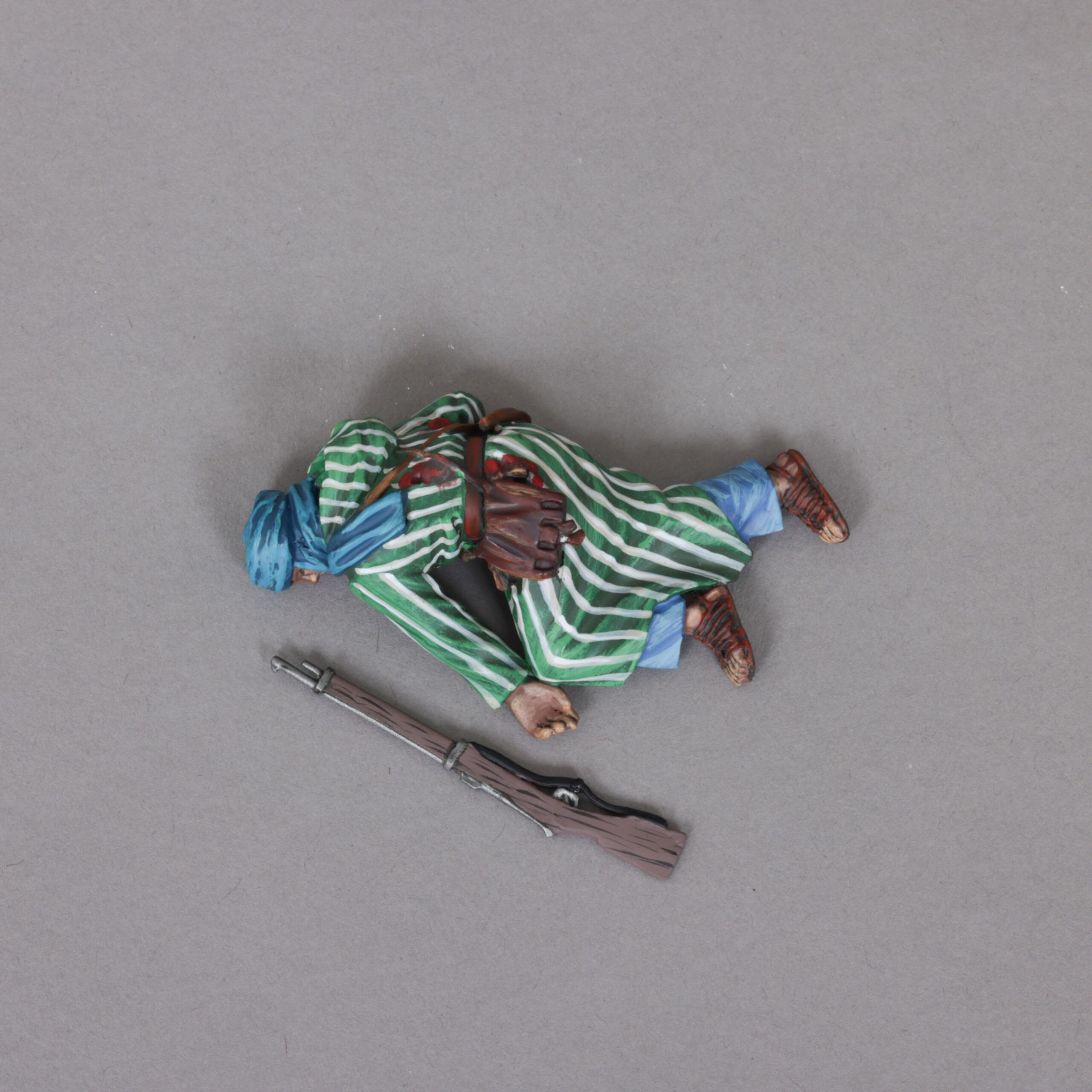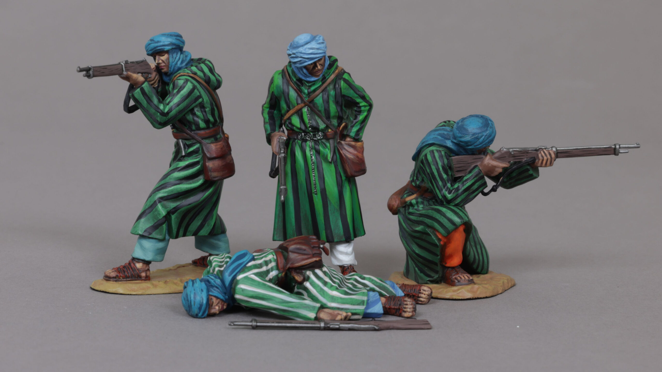 The “Rif Warriors” were the Berber tribesmen who fought against the colonial powers in Morocco. They were known for their fierce fighting skills, marksmanship, and ability to move undetected in the difficult mountain terrain. The Rifian forces consisted mainly of tribal militia who wore ordinary clothes (often djellabas) rather than uniforms. On the head was worn a small cap or turban, the style of the latter varying between the tribes. Following on from these first 4 warriors, will be cavalry, an Iman urging his followers onto meet the 72 virgins waiting for them in heaven and some charging Rif.