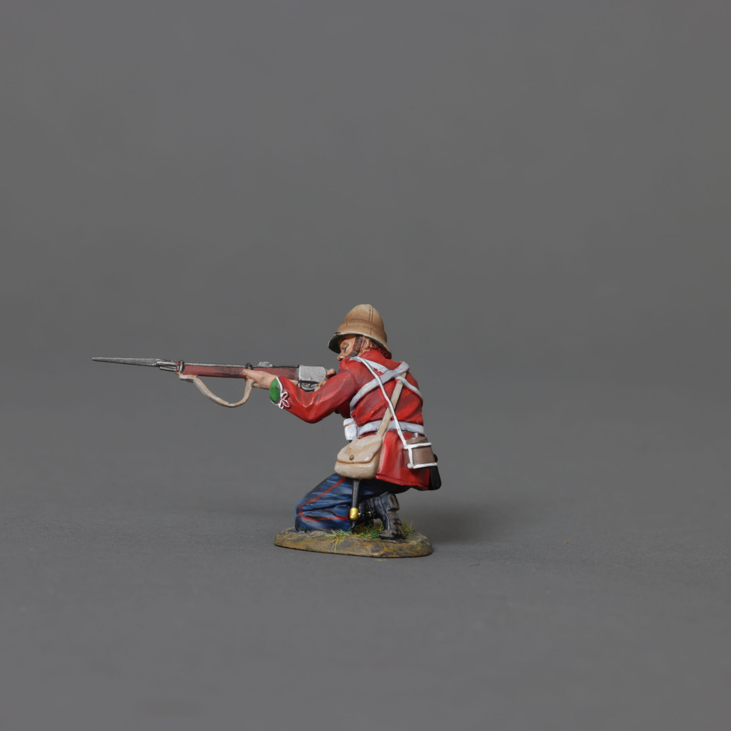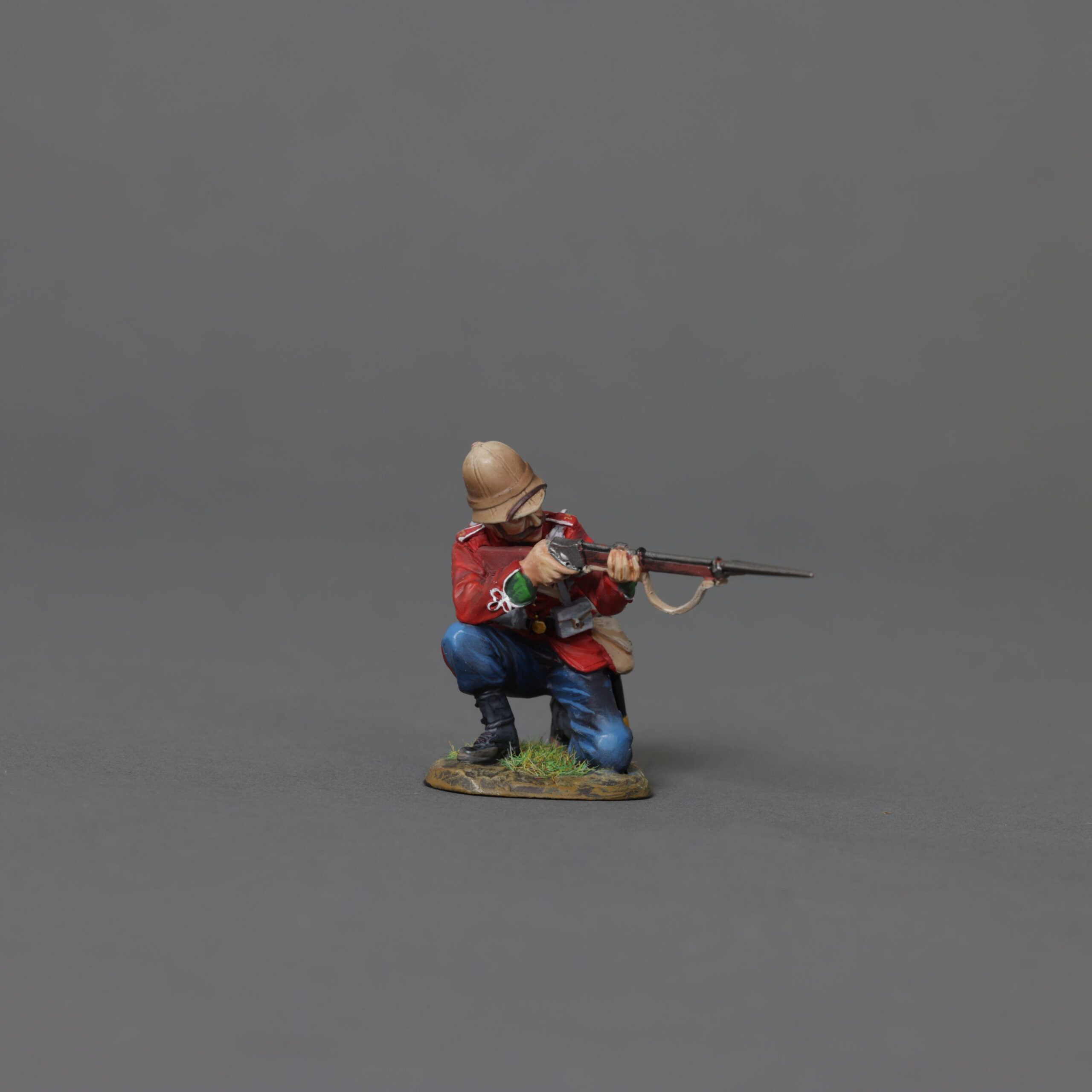 Braced on one knee, firing straight or placed on the corners of a building and/or wagon, as he fires from cover.